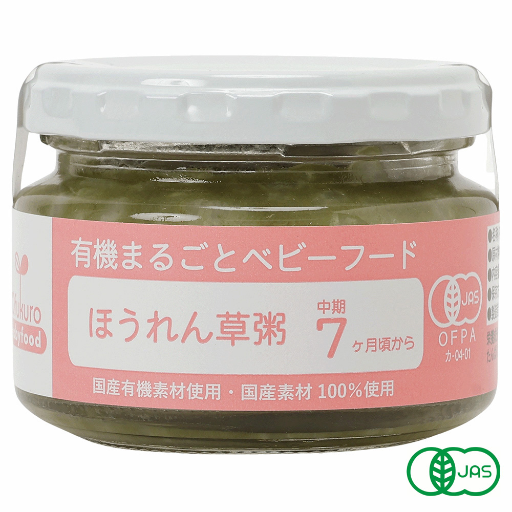 有機JAS認証 Ofukuro有機まるごとベビーフード。国産有機素材と食品添加物無添加にとことんこだわった国産素材100%ベビーフードです。塩や砂糖など余分な味付けはせず国産有機米を国産有機ほうれん草と国産有機じゃがいものペーストで煮込みました。
